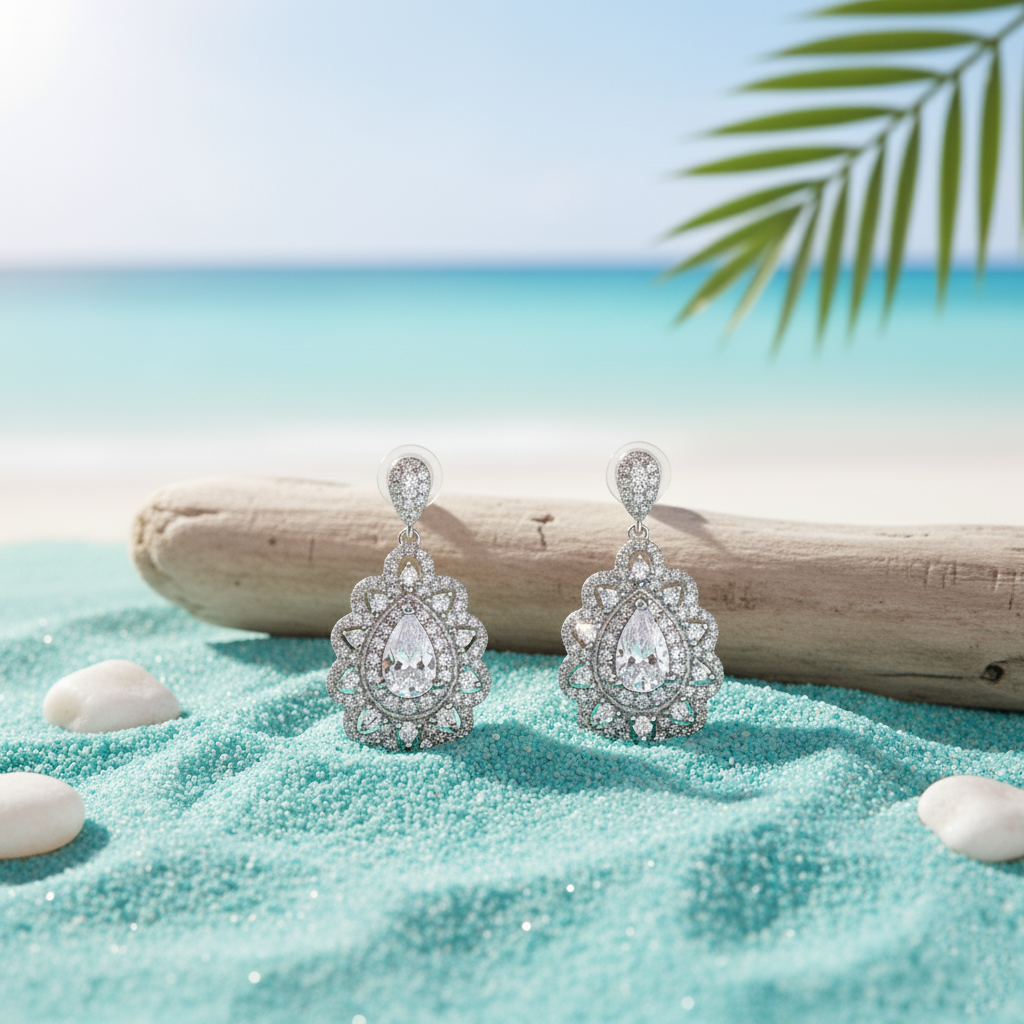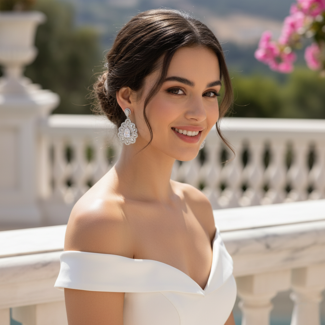 Secured with a sturdy post back, these earrings provide dramatic sparkle and elegant movement. Finished with durable Rhodium Plating, they maintain a bright, tarnish-resistant white-gold luster, making them the ultimate accessory for brides, wedding guests, or black-tie events.